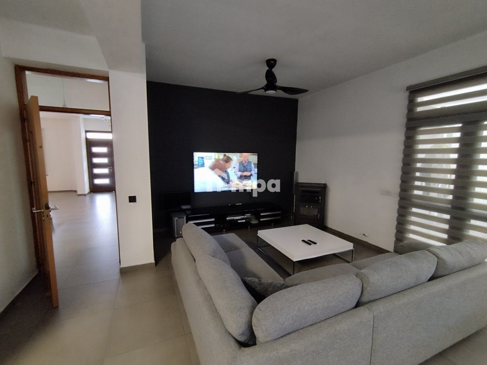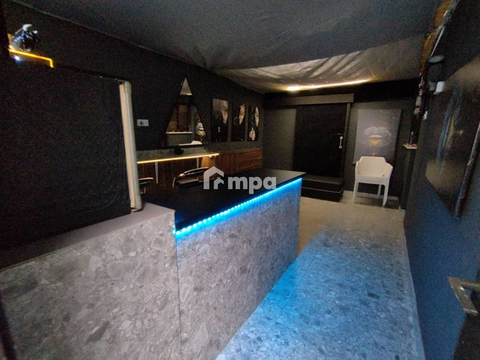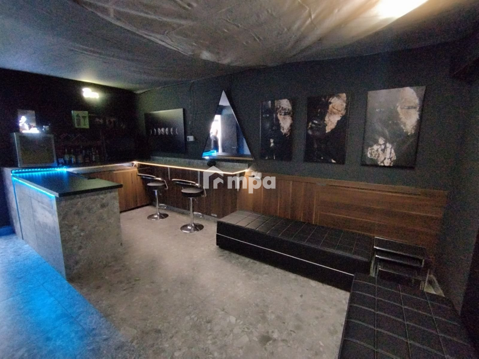 There was a laundry room, three bathrooms, a modern bar area room, a fireplace, and protective cameras.