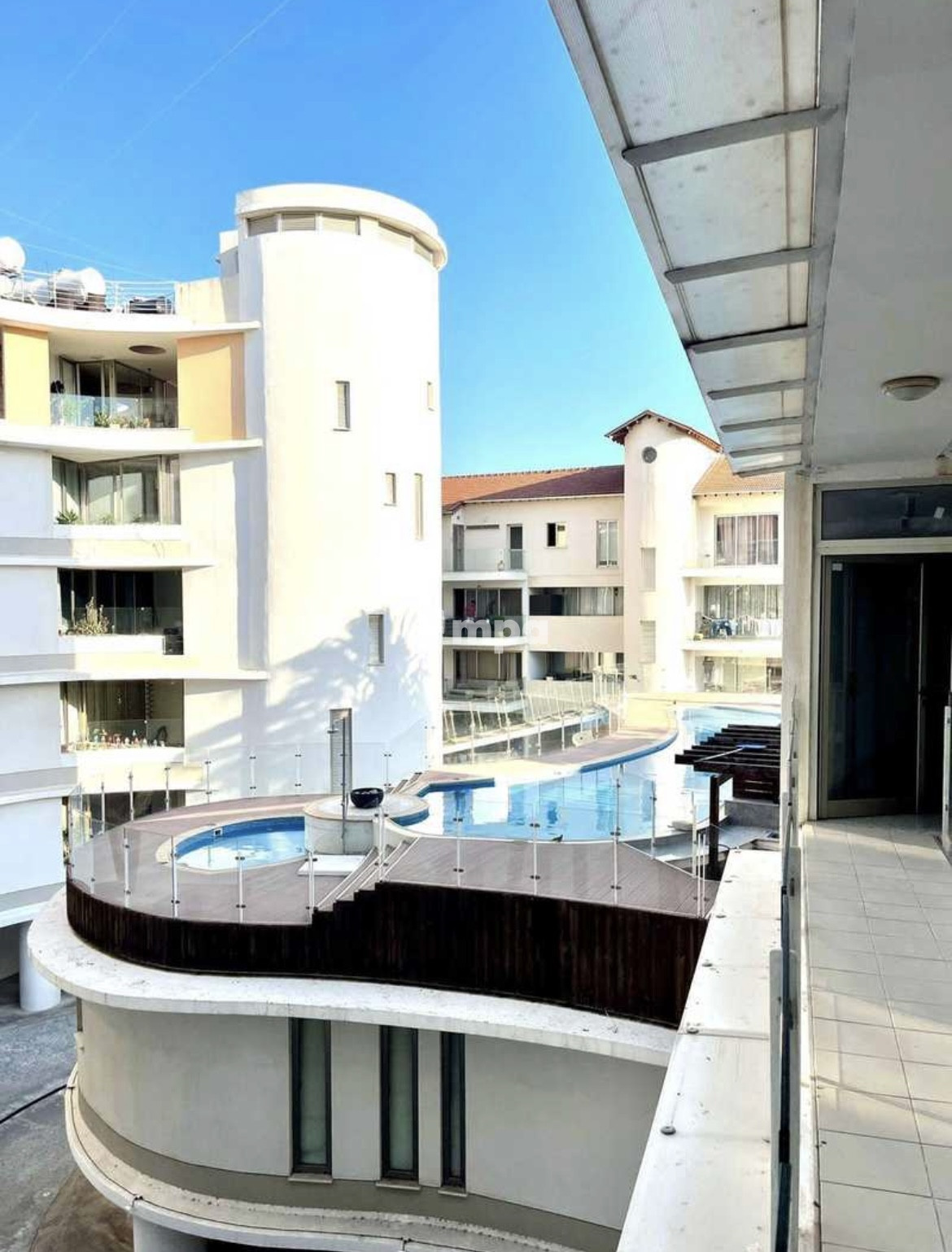 The apartment is on the 3rd floor or a gated complex with a communal pool.